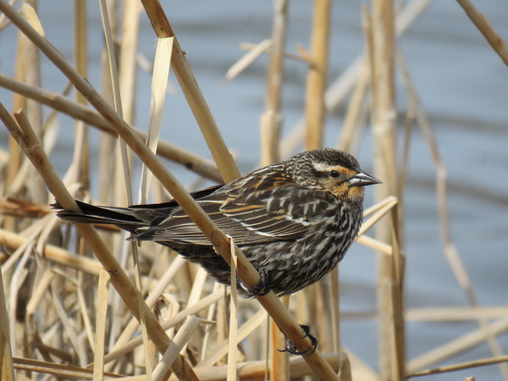 Many shades of brown. Female red winged black bird in it's natural locale in the swamp. Incredible detail.