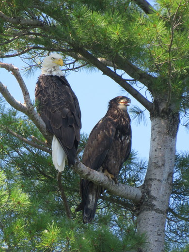 Photo taken from my kayak. Adult and eaglet sitting about 50 feet up in a tall pine at the waters edge. Eaglet crying and crying but not getting any food.