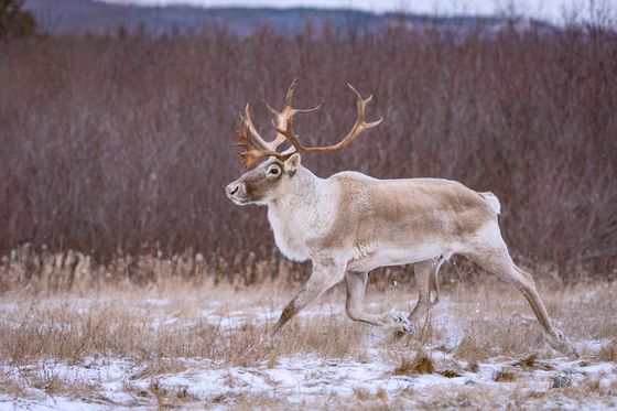 A Woodland Caribou makes a dash for a nearby woods road to join up with the rest of the herd.