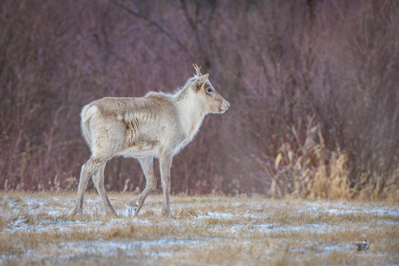 A young Woodland Caribou tries to keep up with the heard after being separated by the arrival of a surprise passenger vehicle.