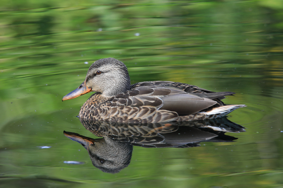 A female Mallard on green looking water