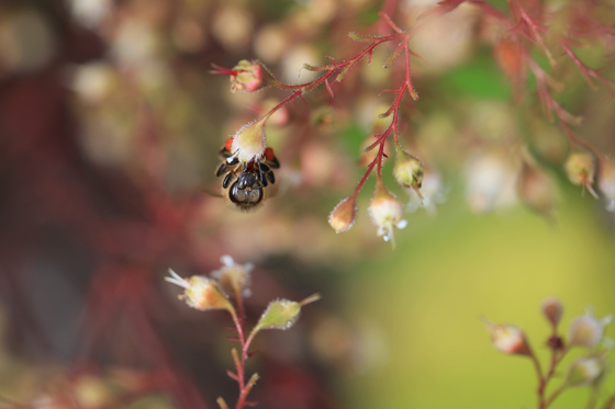 Macrophotography of a tiny bee upside down on a tiny flower.