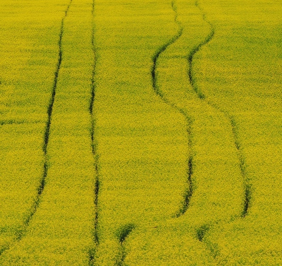 I love the geometric patterns of tracks through the canola fields
