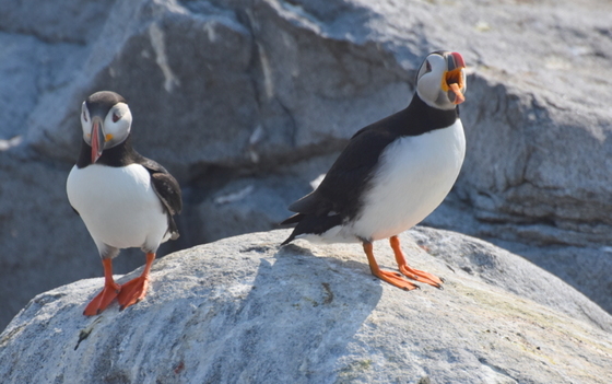 A pair of Puffins seems to be conversing in the Bay of Fundy.
