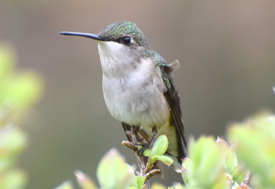 A female Ruby Throated Hummingbird sits on the honeysuckle bush outside my kitchen door.
