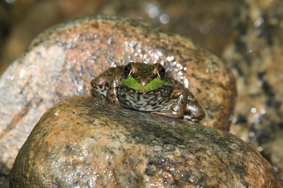 A little frog on a rock at the pond.