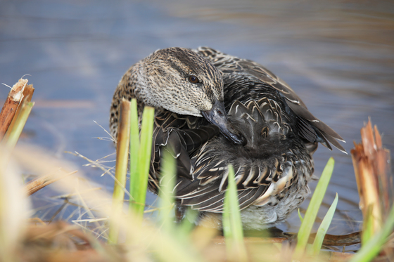 A Green-winged Teal in a pond.