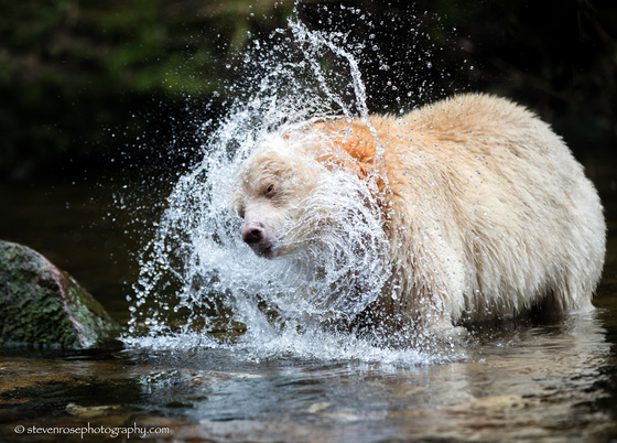 Spirit bear shaking off the water after snorkelling for salmon eggs