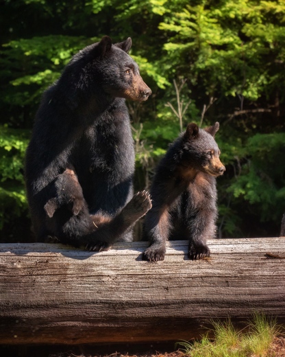 Early morning springtime in Whistler, a mother black bear and her cubs watch the sunrise. Although one of the cubs has not quite finished breakfast.