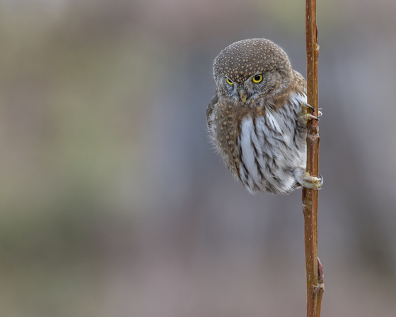 Northern Pygmy Owl clings to a small branch waiting for prey to present itself - Chilliwack BC