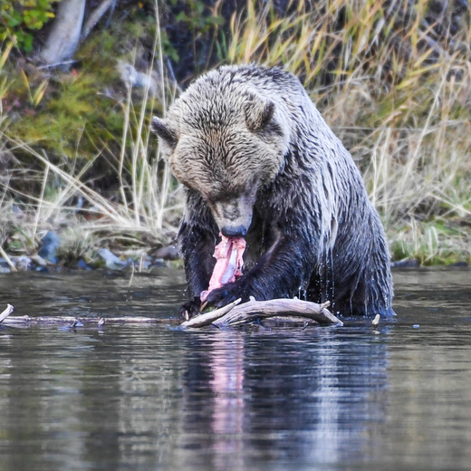 A Grizzly enjoying a freshly caught Sockeye Salmon in The Chilko River in BC.