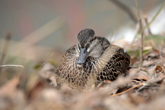 A female Green-winged Teal in dry vegetation at spring