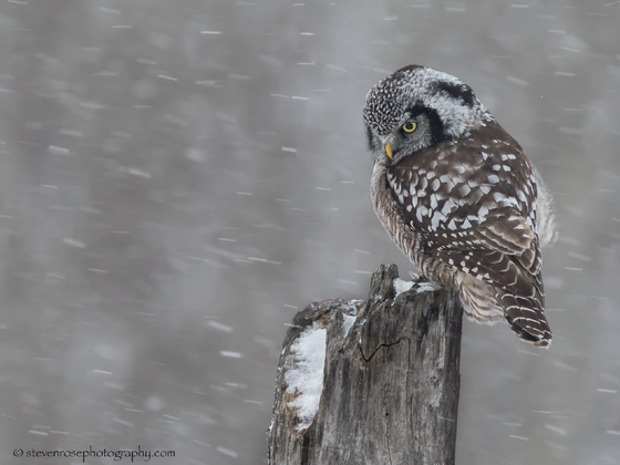 The hawk owl continued to hunt as the snow started to fall adding to the mice and voles it had already stashed