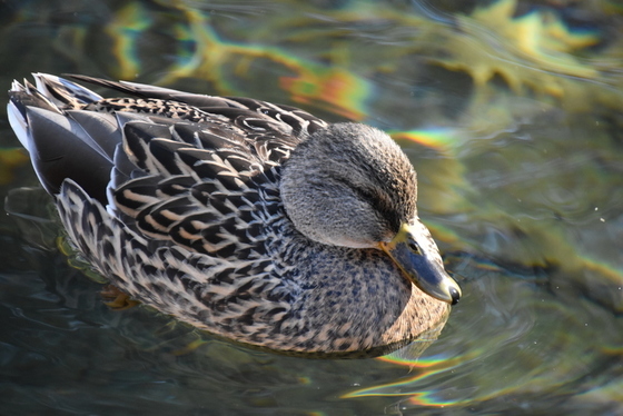 Mallard ducks gather in a pond in a local park.