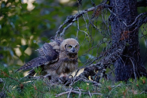 A fledged Great Horned owlet ruffling its wings as it settled onto a pine tree branch.