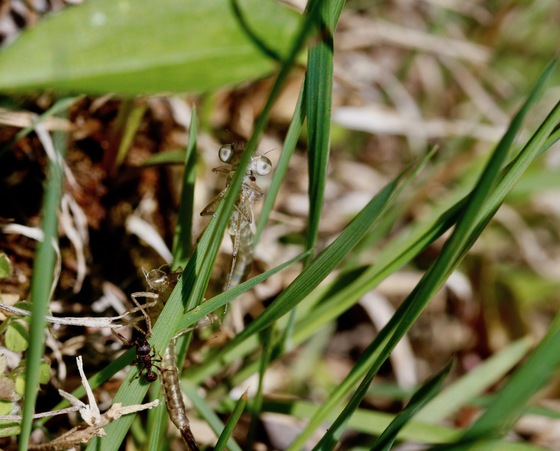 A Damsel fly has just left its nymph stage and started climbing a blade of grass as a red ant moves towards it.