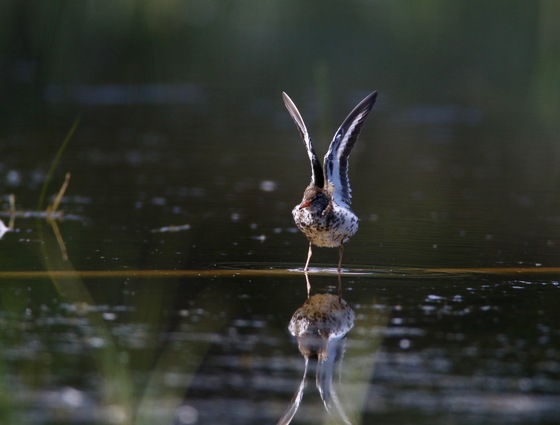 A Spotted Sandpiper stretching in the early morning as it looks for breakfast.