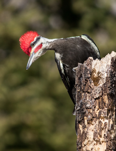 A male pileated woodpecker climbs to the top of an old tree and shows of his brilliant red crest.