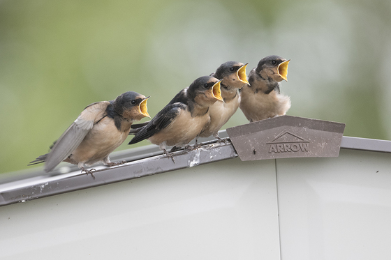 Barn Swallow young. Four hungry mouths all lined up ready to feed on our shed roof after nesting on our house nearby.
