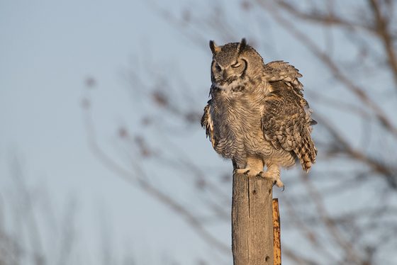 Great horned owl. Time to fluff up and shake down.