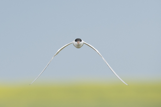 Forster’s tern. Coming in low over a slough with a canola field in the background.
