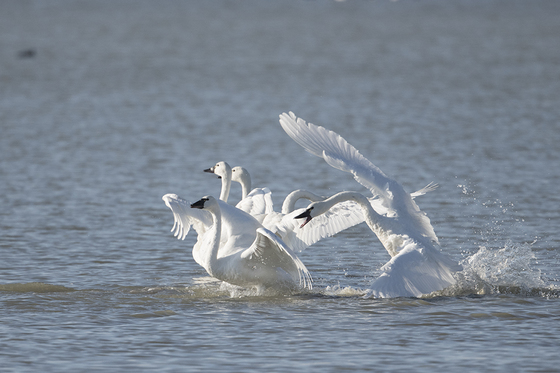 Tundra swans. Noisy dispute among the tundra swans during the fall migration.