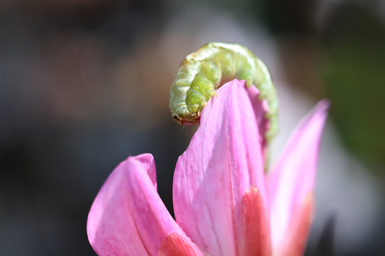 Macrophotography of a worm on a flower.