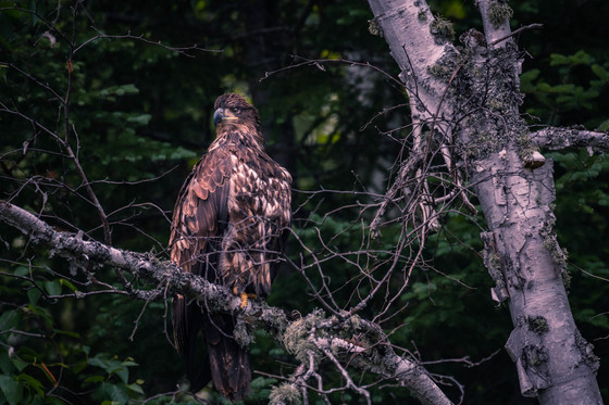 A young bald eagle sits on a branch that overlooks Arrow Lake, in Northwestern Ontario.