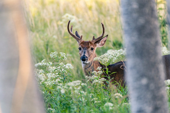 A young buck travels through the tall grass during an evening stroll. Photograph was taken within the city of Thunder Bay, On.