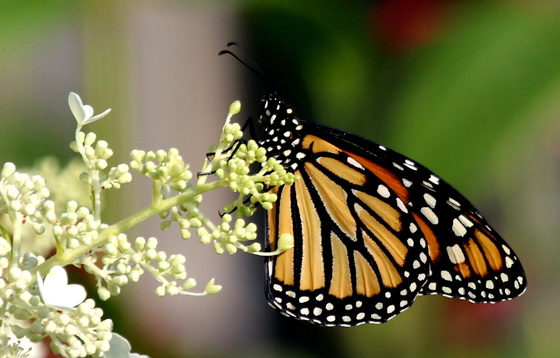 A Monarch Butterfly rests on my hydrangea tree after visiting my milkweed.