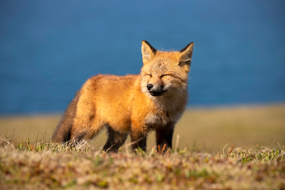 A young fox kit feels the warmth of the morning sun on its face.