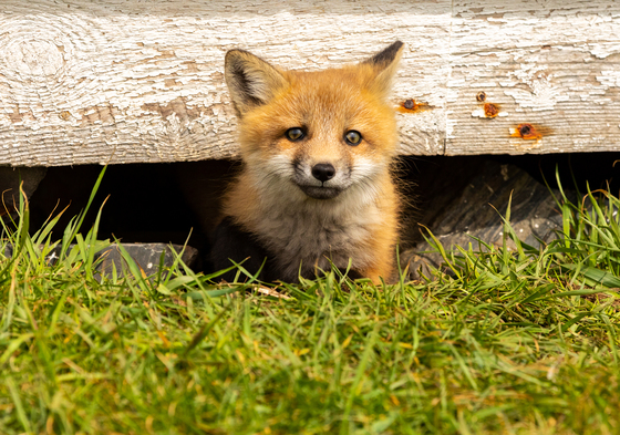 A very young fox kit nervously comes out under a Newfoundland shed to explore the world.