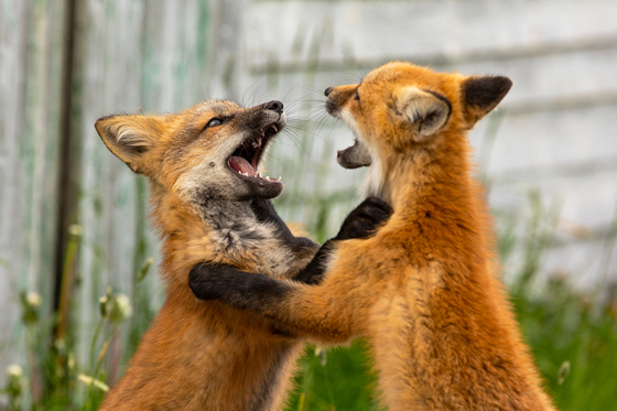 Two young foxes playing next to a old Newfoundland shed.