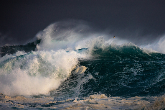 The lone seagull looking for food as the huge waves crash over Middle Cove beach.