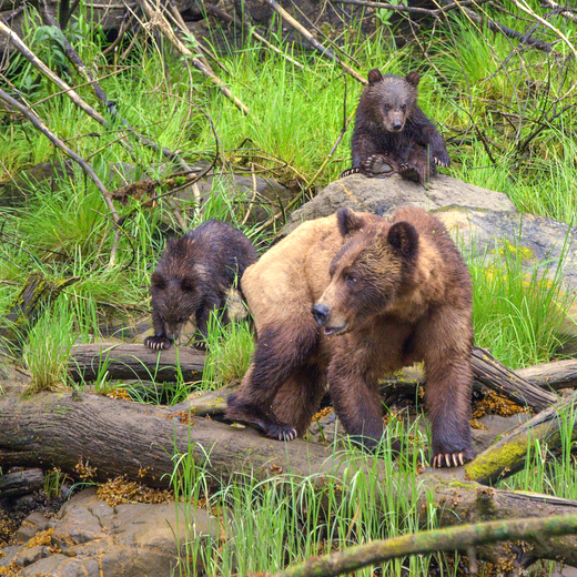 Mom Grizzly and her very young twin Cubs, sitting in the rain.