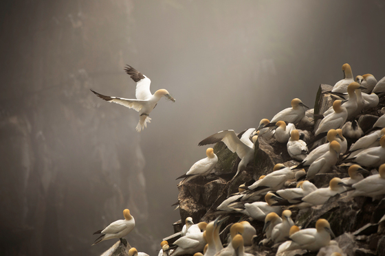 A Northern Gannet returning to its nest with some building material. It was a foggy day and a little ray of light broke through during landing.