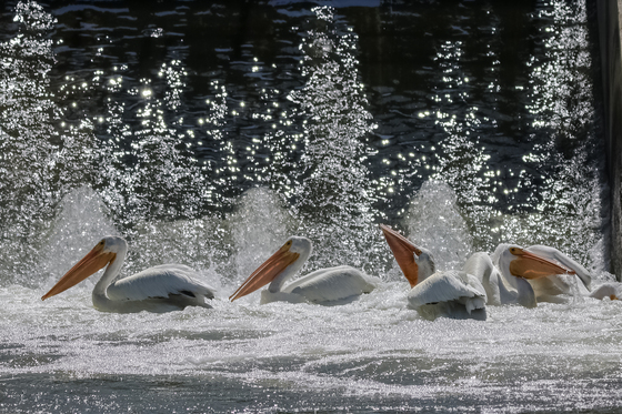The perfect fishing spot for this group of Pelicans at the bottom of a weir at Blackstrap Lake, Saskatchewan