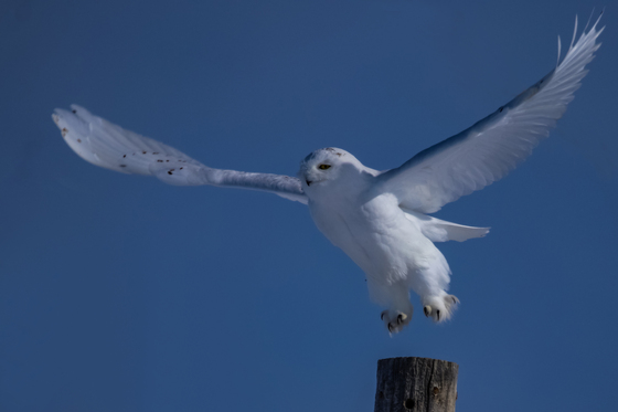 Perfect timing in getting this beautiful male Snowy Owl just as he was landing on the top of a pole