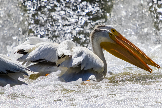 These Pelicans are sharing a perfect fishing spot - right at the bottom of a weir at Blackstrap Lake, Saskatchewan