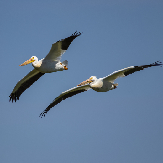 Two Pelicans fly in unison over the waters of Blackstrap Lake, Saskatchewan