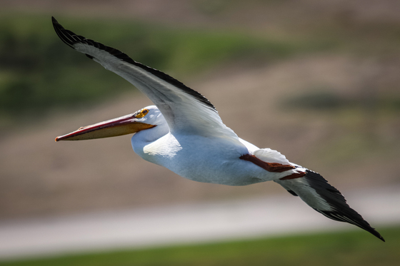 This Pelican soars high above the waters of Blackstrap Lake, Saskatchewan