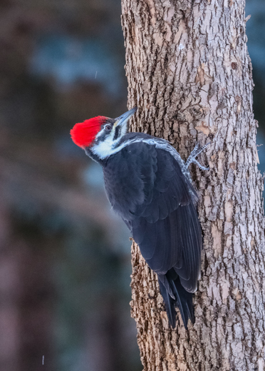 A Pileated Woodpecker flits from tree to tree in search of a good spot to peck for food