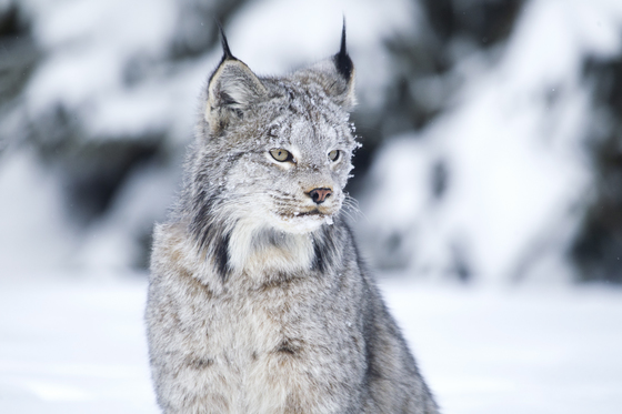 A Canada lynx sits in a snowy clearing. She had moved away from the treeline after having snow blown out of the trees on her by the wind