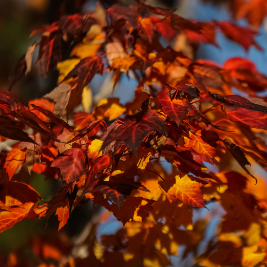 This tree almost looks like it is on fire with all of the beautiful Fall colours that resemble flames.