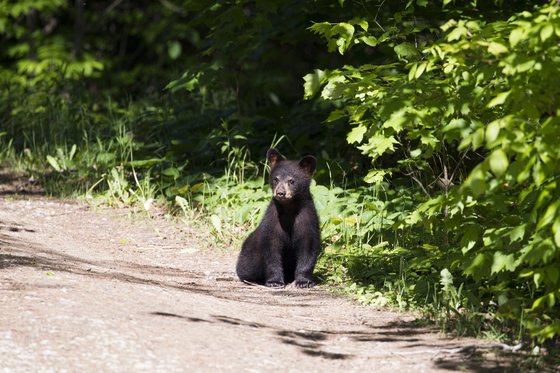 A little bear cub sitting on the edge of a clearing. Mom had walked through the clearing without a concern about me but the little one wasn't quite sure. It didn't take long for mom to summon the cub who finally came walking out after her.
