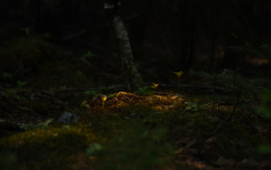 I captured this Cape May Warbler gathering supplies for the nest just after sunrise in Parc national de la Gaspésie. There wasn't much light where I witnessed this bird working, but thankfully it stepped into the spotlight just long enough for me to capture this shot.