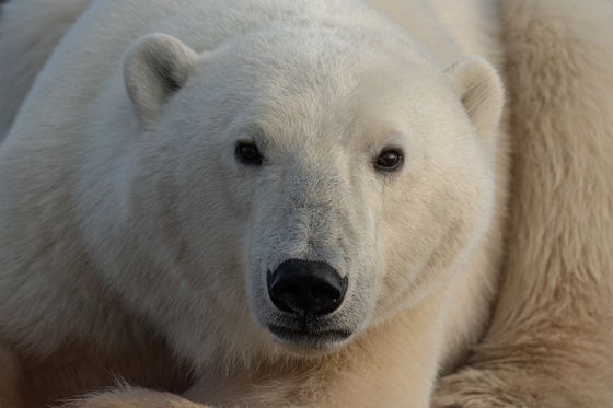 This beautiful polar bear was laying down resting very close to me on its migration north to hunt seals on the sea ice.