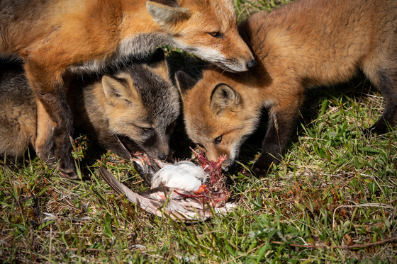 Mom caught a bird to feed here fox kits. It was interesting to see the interaction of the fox kits when they knew mom was back with breakfast. Mom never had any of it as it was just for her kits.