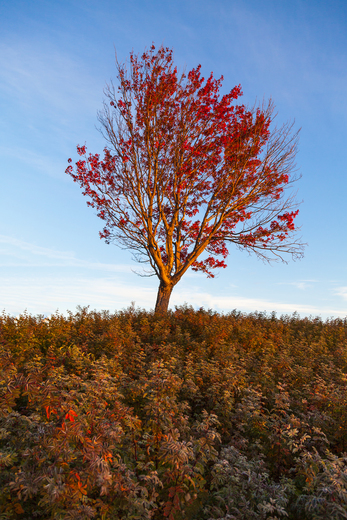 An autumn tree at sunrise with frost on the plants in the foreground.
