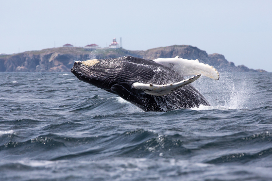 A rare shot of a lifetime to capture a humpback whale breaching with the Bonavista lighthouse in the background.